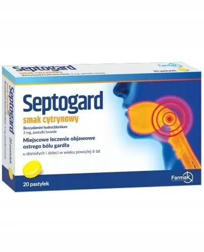 OpisSeptogard 3 mg o smaku cytrynowym zawiera benzydaminy chlorowodorek jako substancj臋 czynn膮. Jest przeznaczony do miejscowego leczenia objawowego ostrego b贸lu gard艂a u doros艂ych oraz dzieci od 6. roku 偶ycia.
