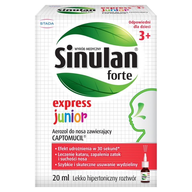 OpisSinulan Express Forte Junior to spray do nosa, przeznaczony dla dzieci powy偶ej 3 roku 偶ycia. Zawiera w swoim sk艂adzie substancj臋 czynn膮 Captomucil庐 oraz inne sk艂adniki. Preparat jest przeznaczony do stosowania w leczeniu kataru, zapalenia zatok oraz nawil偶ania suchej 艣luz贸wki nosa.