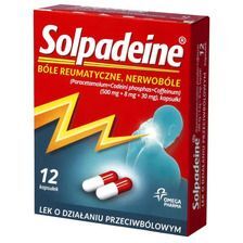 OpisSolpadeine w formie 12 kapsułek to lek zawierający trzy składniki aktywne: paracetamol, kodeinę oraz kofeinę. Efekt terapeutyczny wynika ze współdziałania tych substancji. Paracetamol wykazuje właściwości przeciwbólowe i obniżające gorączkę.