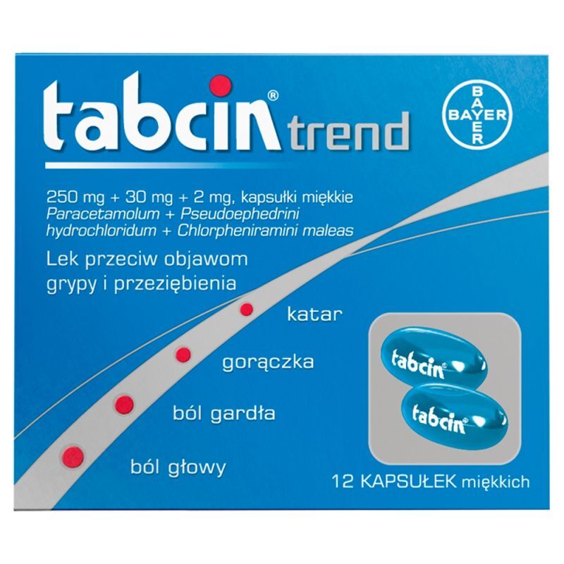 OpisTabcin Trend to preparat o działaniu przeciwbólowym i przeciwgorączkowym, który dodatkowo pomaga w udrożnieniu nosa. W formie kapsułek miękkich zawiera trzy składniki aktywne: paracetamol, pseudoefedrynę oraz chlorfeniraminę, skutecznie łagodzące symptomy grypy i przeziębienia. Stosowany jest przy takich dolegliwościach jak gorączka, katar, ból gardła i uczucie drapania, kichanie, ból głowy, obrzęk błony śluzowej nosa i zatok oraz ogólne osłabienie organizmu.
