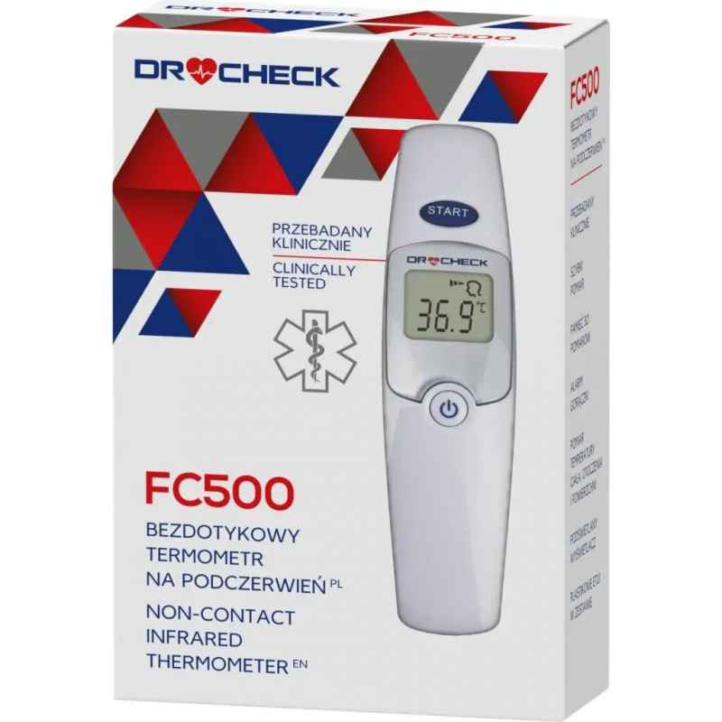 OpisDr. Check FC500 to medyczny termometr na podczerwie艅, pozwalaj膮cy na bezdotykowy pomiar temperatury cia艂a i otoczenia.