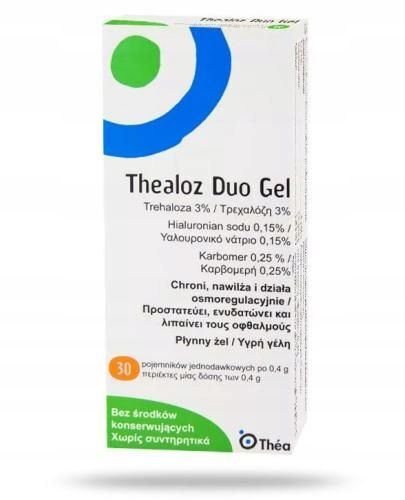 PrzeciwwskazaniaNie wstrzykiwać, nie połykać. Nie należy stosować produktu THEALOZ® DUO GEL w przypadku uczulenia na którykolwiek ze składników (patrz opis wyrobu). Osoby noszące soczewki kontaktowe: należy je zdjąć przed zastosowaniem THEALOZ® DUO GEL. Przed zastosowaniem należy dokładnie umyć ręce. Nie używać żadnych narzędzi do otwierania pojemnika. Przed pierwszym użyciem tego produktu należy sprawdzić, czy opakowanie jest nienaruszone: używać tylko wtedy, gdy saszetki i pojemniki jednodawkowe nie były otwarte. Aby uniknąć zanieczyszczenia, nie należy dotykać końcówką pojemnika do żadnej powierzchni. Nie używać pojemnika ponownie, ponieważ po otwarciu zawartość nie jest chroniona przed skażeniem mikrobiologicznym. Jeśli objawy nasilą się lub nie ulegną poprawie, należy skontaktować się z lekarzem lub farmaceutą. Przechowywać w miejscu niewidocznym i niedostępnym dla dzieci. Po zastosowaniu nie należy prowadzić pojazdów ani obsługiwać maszyn, jeśli widzenie jest niewyraźne: należy zaczekać kilka minut, aż powróci normalne widzenie. Należy odczekać co najmniej 15 minut pomiędzy zastosowaniem dwóch różnych produktów do oczu THEALOZ® DUO GEL należy zastosować jako ostatni.