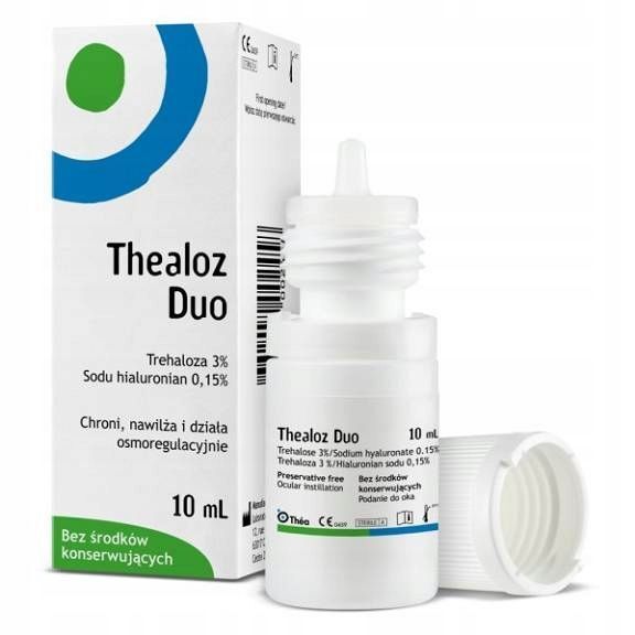 PrzeciwwskazaniaNie wstrzykiwać, nie połykać. Nie stosować THEALOZ® DUO w przypadku uczulenia na którykolwiek ze składników (patrz opis wyrobu). Przed zastosowaniem należy dokładnie umyć ręce. Nie używać żadnych narzędzi do otwierania butelki. Butelka z produktem nie powinna być stosowana przez różne osoby, aby zapobiec zanieczyszczeniu krzyżowemu. Przed pierwszym użyciem produktu należy sprawdzić czy opakowanie jest nienaruszone. Przed pierwszym użyciem należy sprawdzić czy pierścień zabezpieczający zakrętkę nie jest naruszony. Aby uniknąć zanieczyszczenia nie należy dotykać końcówką butelki do żadnej powierzchni. Jeśli objawy nasilą się lub nie ulegną poprawie, należy skontaktować się z lekarzem lub farmaceutą. Przechowywać w miejscu niewidocznym i niedostępnym dla małych dzieci. Po zastosowaniu nie należy prowadzić pojazdów ani obsługiwać maszyn, jeśli widzenie jest niewyraźne: należy zaczekać kilka minut, aż powróci normalne widzenie. Należy odczekać co najmniej 10 minut pomiędzy zastosowaniem dwóch różnych produktów do oczu. Nie należy rozcieńczać produktu THEALOZ® DUO ani mieszać go z innymi roztworami. Po pierwszym użyciu, w przypadku narażenia na niskie ciśnienie atmosferyczne, płyn z butelki może wyciekać.