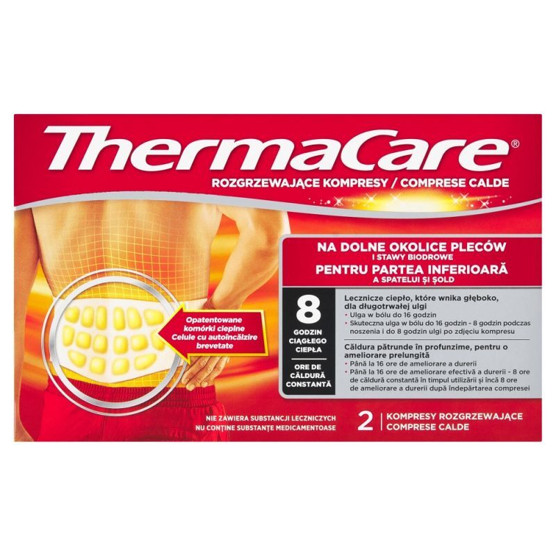 OpisThermaCare kompresy rozgrzewające na plecy i biodra (2 sztuki) skutecznie łagodzą bóle mięśni i stawów spowodowane przeciążeniem, napięciem mięśniowym, sztywnością oraz stanami zapalnymi. Produkt jest przeznaczony do stosowania na dolną część pleców lub okolice stawów biodrowych. Kompresy są wyrobem medycznym dedykowanym dla osób dorosłych i działają poprzez rozgrzewanie obszaru objętego dolegliwościami.