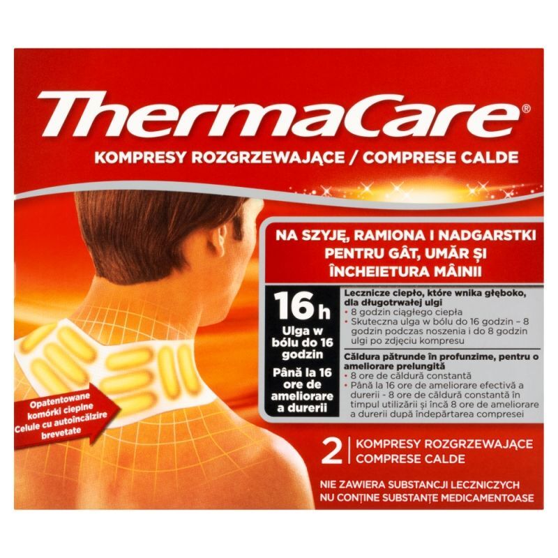 Kompresy ThermaCare charakteryzują się ergonomicznym kształtem, który elastycznie dopasowuje się do ruchów ciała i precyzyjnie przylega do skóry na szyi, barkach, karku, ramionach i nadgarstkach. Wyposażone w 10 opatentowanych komórek cieplnych, są proste w użyciu – wystarczy usunąć folię ochronną i przykleić kompres do bolącego miejsca za pomocą dwóch taśm samoprzylepnych.