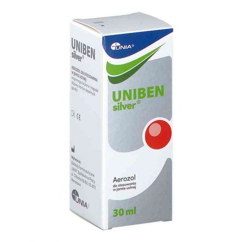 OpisUniben Silver to wyrób medyczny w postaci aerozolu do stosowania w jamie ustnej, który wspomaga leczenie i łagodzi stany zapalne błony śluzowej gardła. Jest również zalecany przy stanach zapalnych dziąseł, po zabiegach dentystycznych oraz po usunięciu migdałków podniebiennych. Preparat można stosować u małych dzieci oraz osób dorosłych bez ograniczeń wiekowych.
