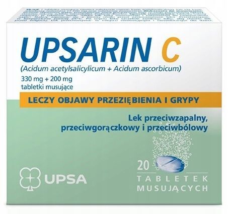 OpisUpsarin C to lek wielosk艂adnikowy, stosowany w przypadku przezi臋bienia, grypy, gor膮czki oraz b贸lu. Zawiera dwie substancje aktywne: kwas acetylosalicylowy i kwas askorbowy (witamin臋 C).