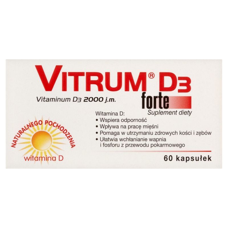 OpisVitrum D3 Forte to suplement diety zawieraj膮cy naturaln膮 witamin臋 D, kt贸ra wspiera odporno艣膰, zdrowie ko艣ci i z臋b贸w oraz metabolizm wapnia i fosforu. Przeznaczony jest dla doros艂ych, kobiet w ci膮偶y, karmi膮cych piersi膮 oraz os贸b powy偶ej 60. roku 偶ycia.