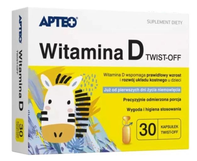 Kapsu艂ka preparatu Witamina D twist-off APTEO DZIECKO dostarcza dok艂adnie odmierzon膮 identyfikacj臋 diagnostyczn膮 D3.