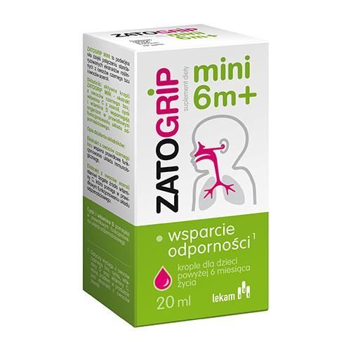 OpisZatogrip mini 6m+ to suplement diety zawieraj膮cy ekstrakt z owoc贸w czarnego bzu oraz aceroli. Produkt jest przeznaczony dla dzieci powy偶ej 6. miesi膮ca 偶ycia.