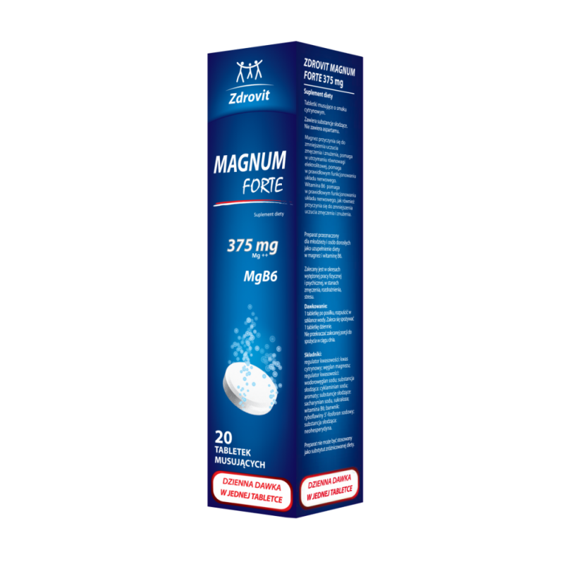 Zdrovit Magnum Forte to tabletki musujące zawierające magnez, który wspomaga zmniejszenie uczucia zmęczenia i znużenia, pomaga utrzymać równowagę elektrolitową oraz wspiera prawidłowe funkcjonowanie układu nerwowego. Dodatkowo preparat został wzbogacony o witaminę B6, która ma korzystny wpływ na układ nerwowy i przyczynia się do zmniejszenia uczucia zmęczenia i znużenia.