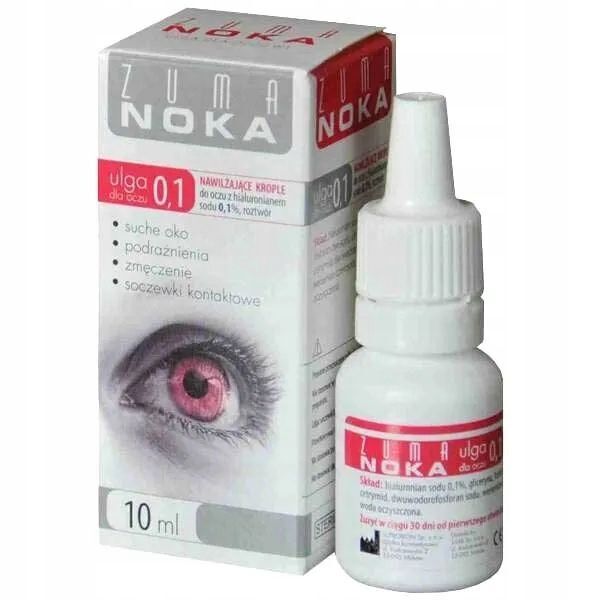 OpisZuma Noka 0,2 to medyczny preparat w formie kropli do oczu, zawieraj膮cy 0,2% roztw贸r hialuronianu sodu o w艂a艣ciwo艣ciach nawil偶aj膮cych. Produkt dost臋pny jest w butelce o pojemno艣ci 10 ml i przeznaczony do 艂agodzenia dolegliwo艣ci zwi膮zanych z sucho艣ci膮 oczu.